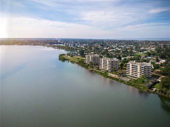 El proyecto incluye tres torres con 123 apartamentos de 1, 2 y 3 dormitorios y 151 cocheras, en un entorno pensado para disfrutar el lago y actividades como kayak o paddleboard.