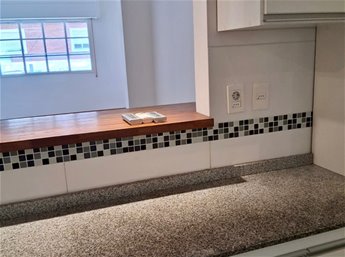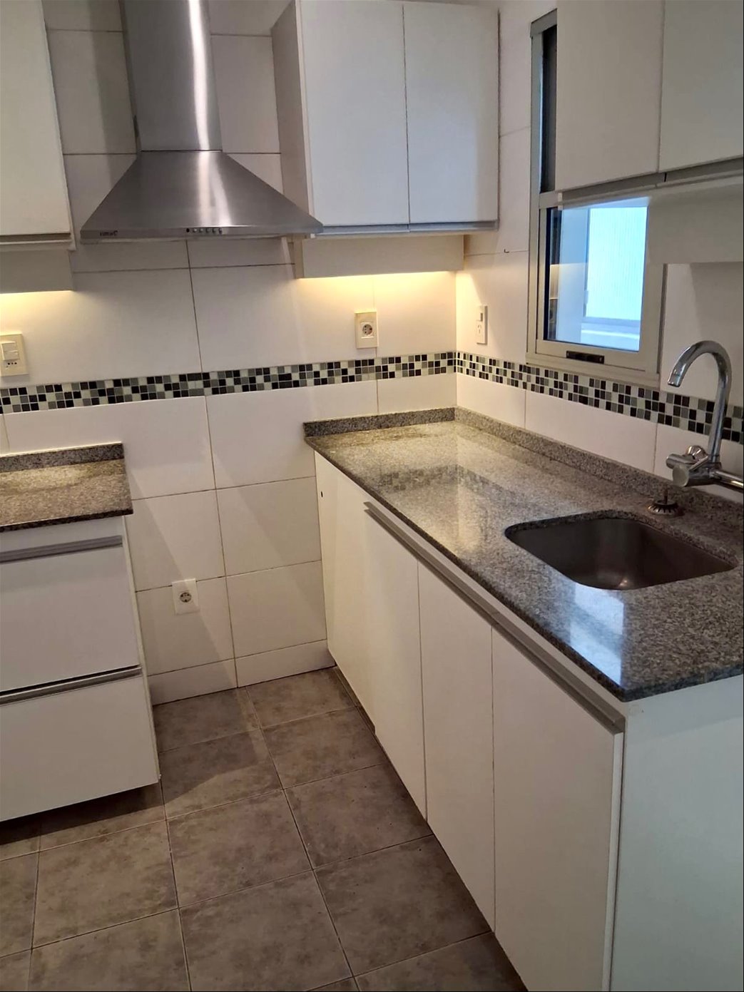 Hermosa cocina con muebles sobre y bajo mesadas y campana.