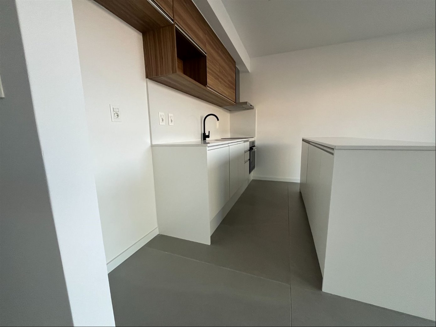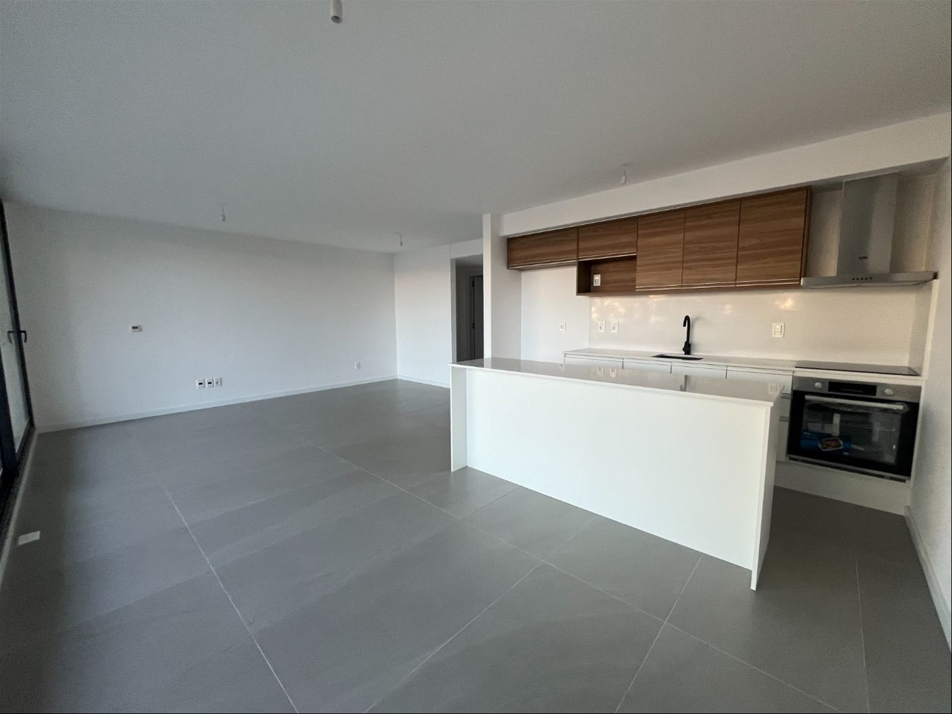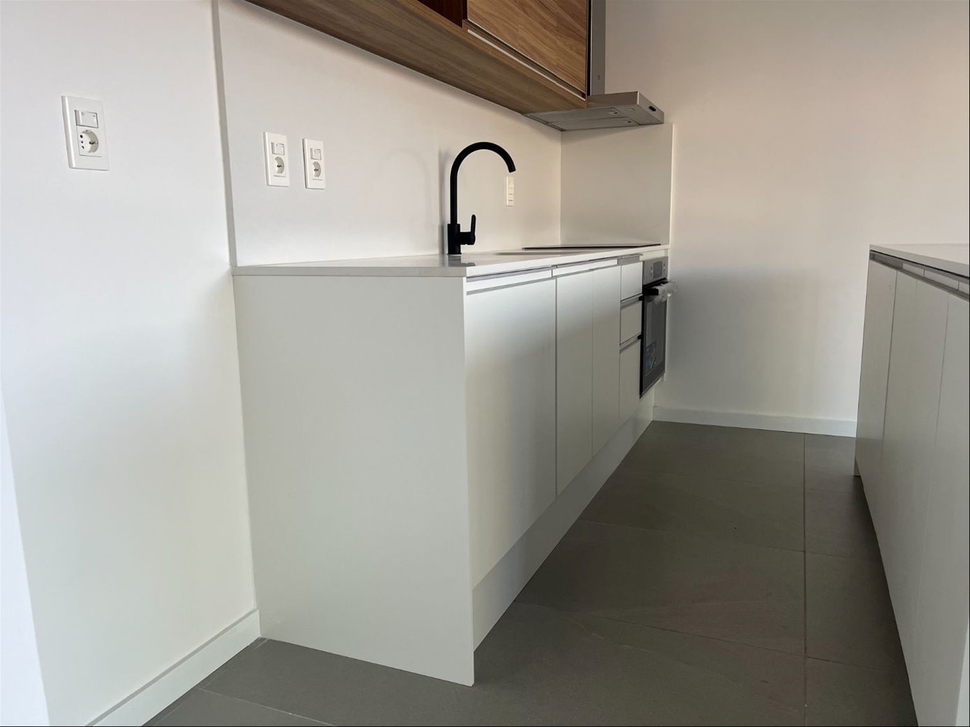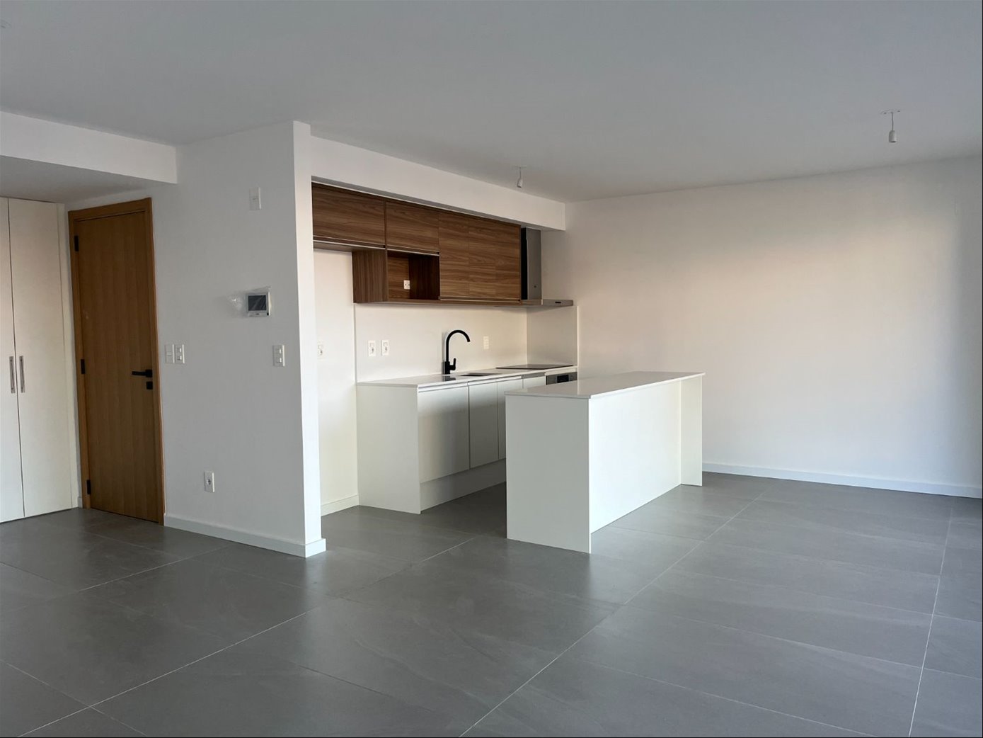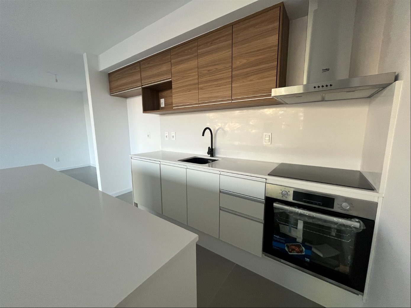 Cocina integrada con hermosa mesada de quartzo que incluye línea blanca: horno empotrado, anafe, purificador y barra auxiliar.
