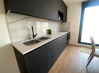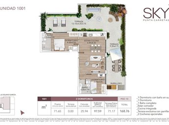 El área social se compone de un amplio living comedor con salida a una espectacular terraza de 71 m² con parrillero, ideal para disfrutar del aire libre y vistas despejadas de la ciudad. La cocina, integrada mediante barra, está equipada con horno, anafe y campana de acero inoxidable.