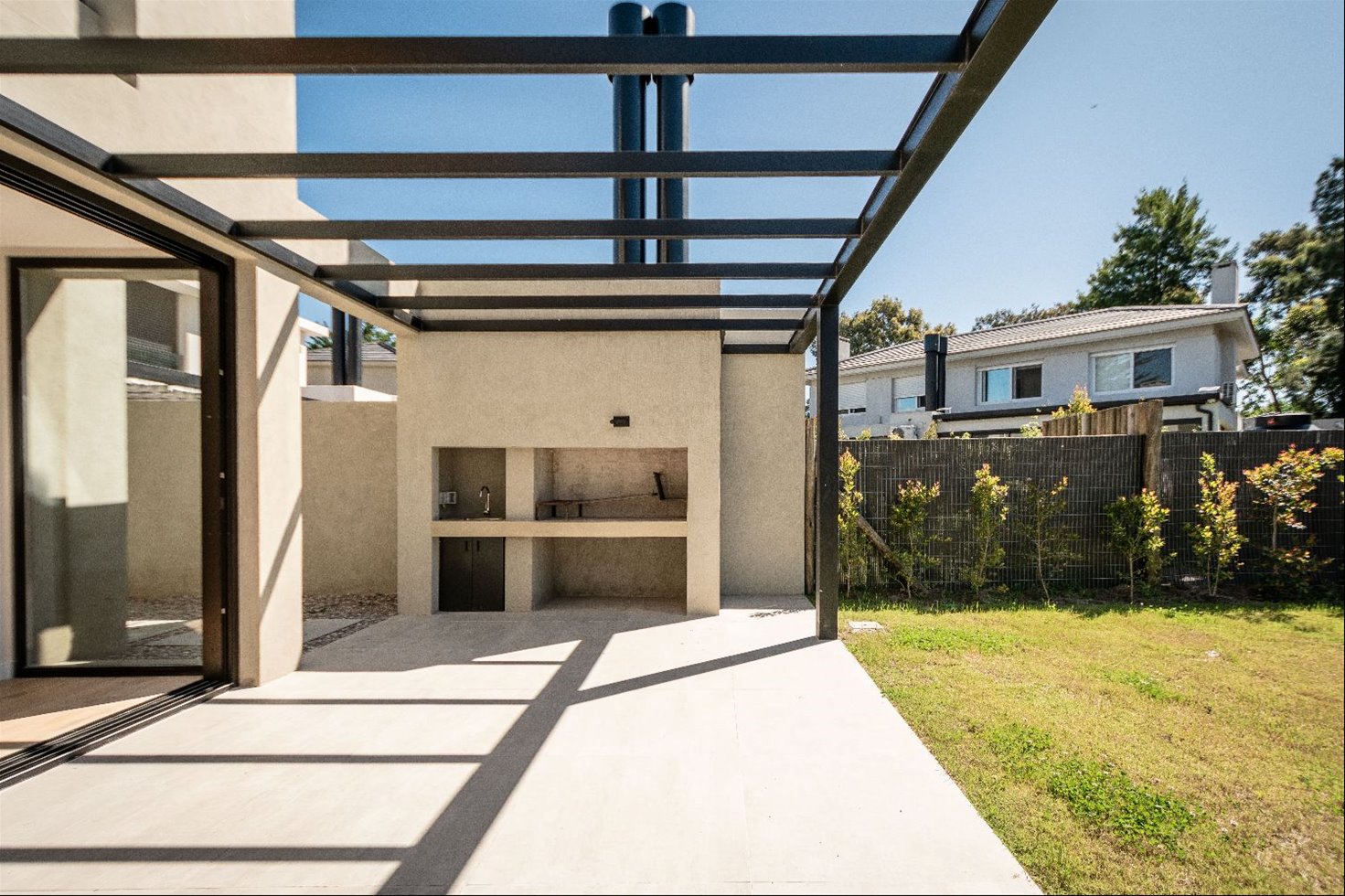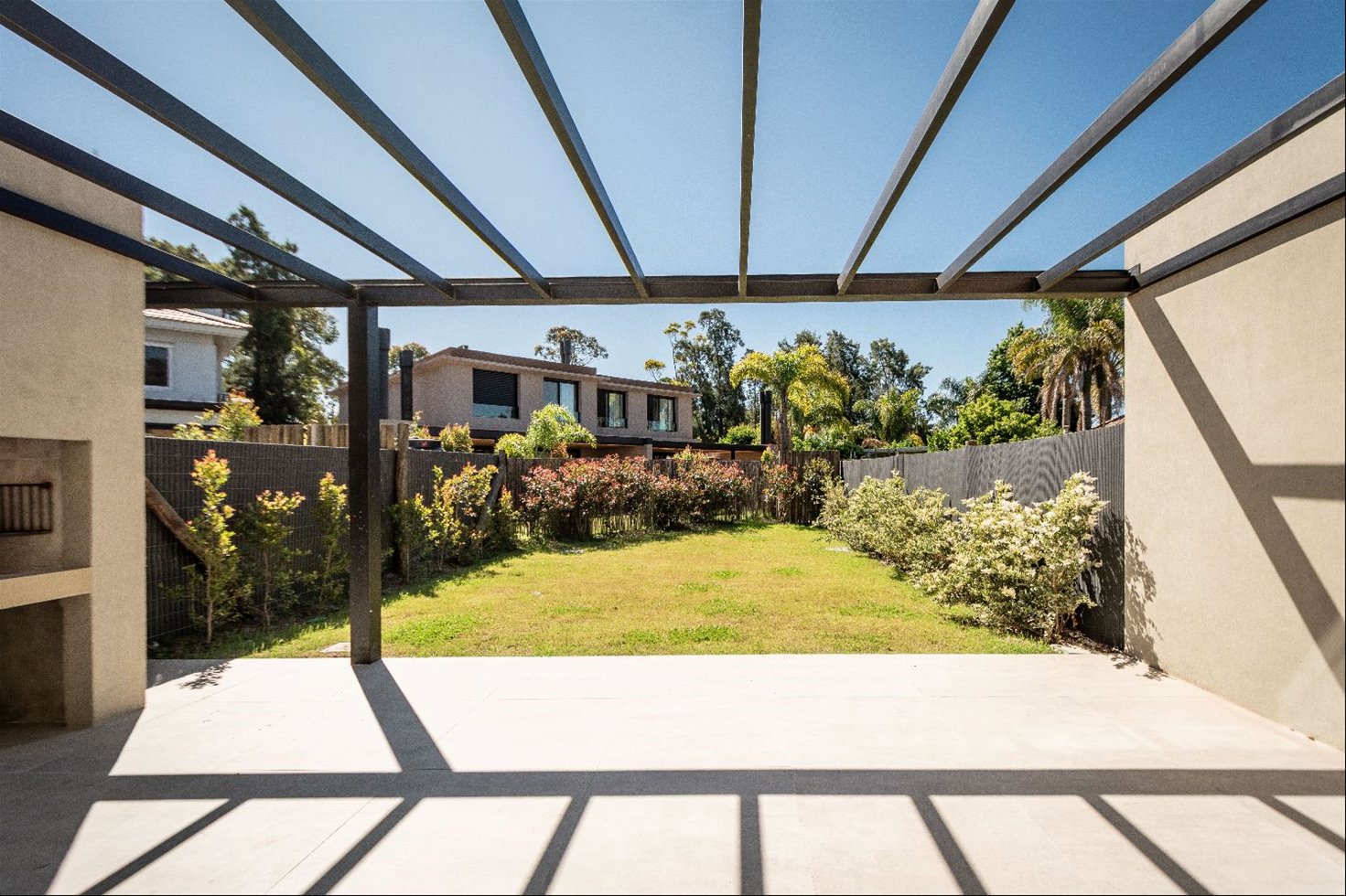 Exterior con jardín y parrillero.