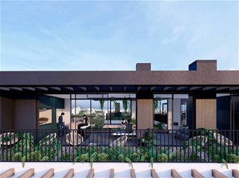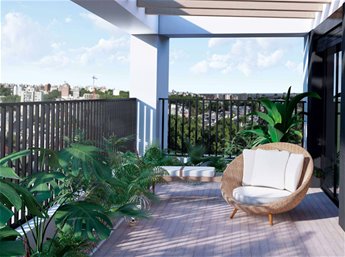 Edificio de 10 pisos con unidades monoambientes, 1 y 2 dormitorios, todas con terraza y diseño luminoso y contemporáneo.