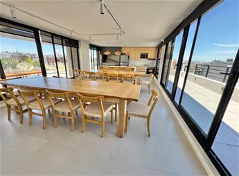 La unidad cuenta con un amplio living comedor con cocina integrada, equipada con horno, campana y anafe. Salida a terraza de gran dimensión.