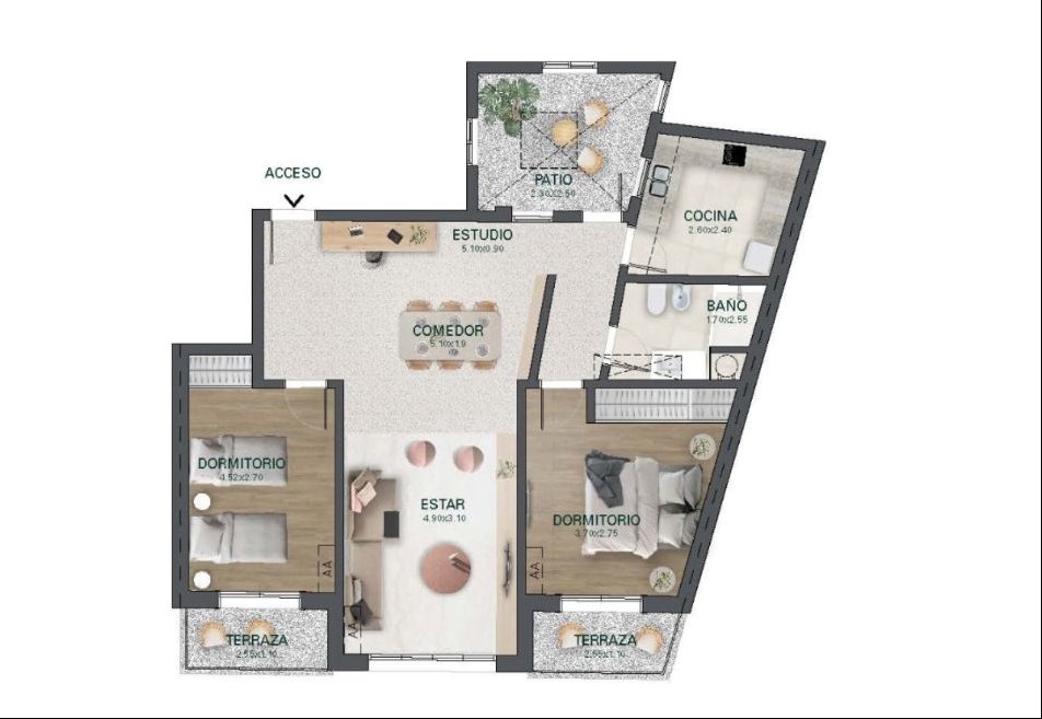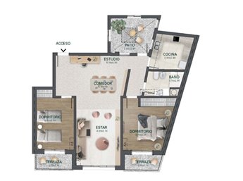 La unidad: -102 m² totales -2 dormitorios (con salida al balcón) -1 baño -Living comedor -Cocina Definida -Balcón -Patio -2 garajes en línea