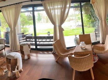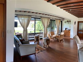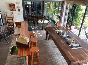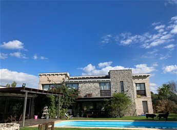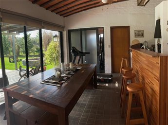 Amplia y muy luminosa. Living comedor con estufa a leña y grandes ventanales con vista al jardín. Baño social. Cocina integrada con muebles sobre y bajo mesada, y comedor diario. Lavadero. Servicio completo.