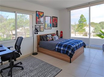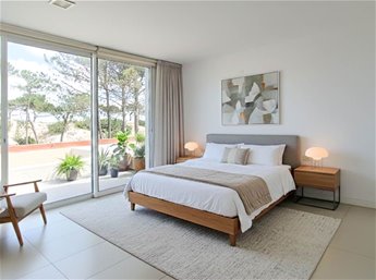 La casa se desarrolla en 2 plantas. En planta baja: living comedor con amplios ventanales y doble altura, estar integrado a la cocina, toilette, dormitorio 1 en suite con baño completo, dormitorio 2 . Planta alta: dos amplios dormitorios en suite, ambos con terraza y vista a las dunas.