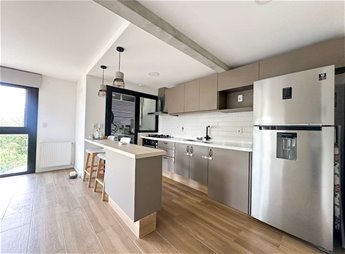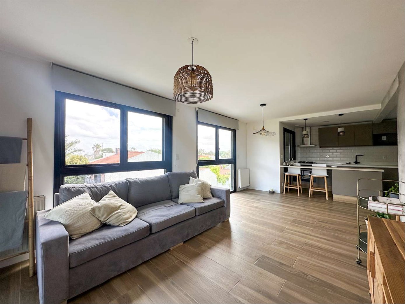 El área social se compone de un luminoso living comedor con grandes ventanales y salida a una terraza techada con parrillero. La cocina se integra mediante barra desayunadora y se encuentra totalmente equipada con horno, anafe, campana y placares aéreos y bajo mesada. Desde allí se accede a una práctica terraza lavadero/de depósito que aporta funcionalidad adicional.