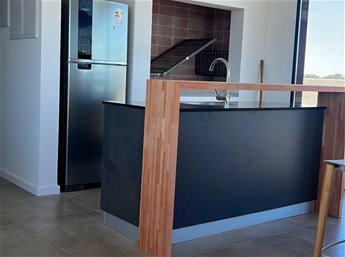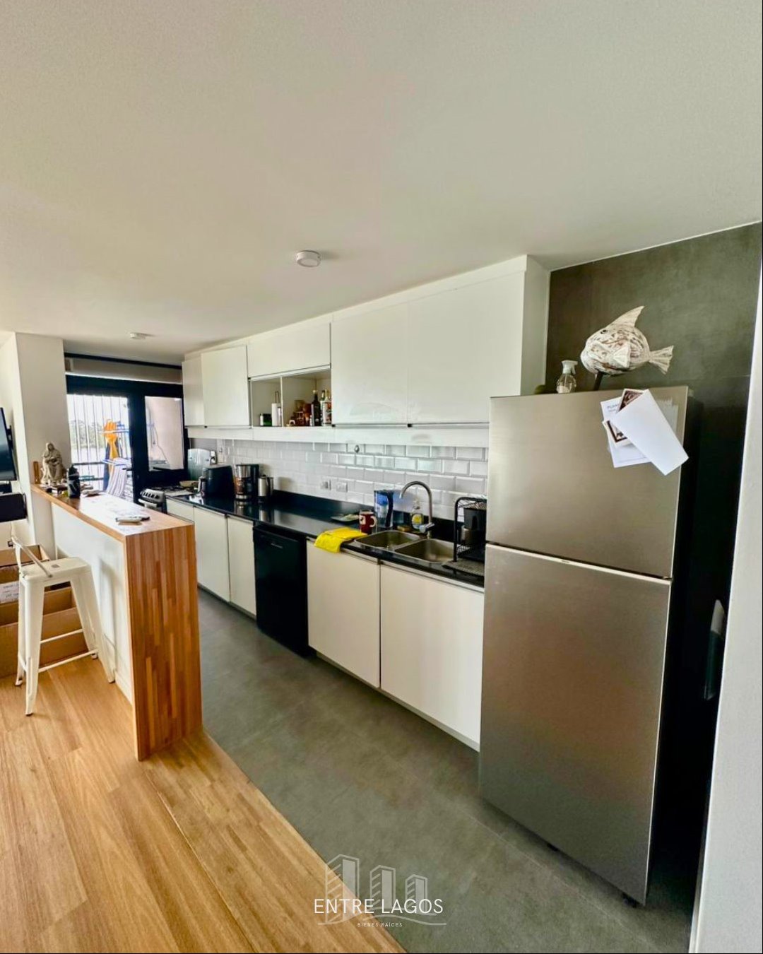 Cocina integrada con barra y placares sobre y bajo mesada.