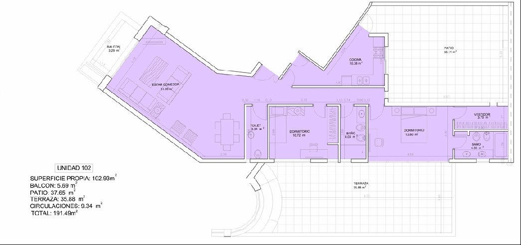 En una superficie total de 193m2, ingresamos a gran living comedor con balcon al frente, 2 dormitorios uno en suite con vestidor y salida a gran terraza de 36 m2, toilette, cocina definida totalmente equipada con desayunador, zona lavadero y salida a patio de 38m2.