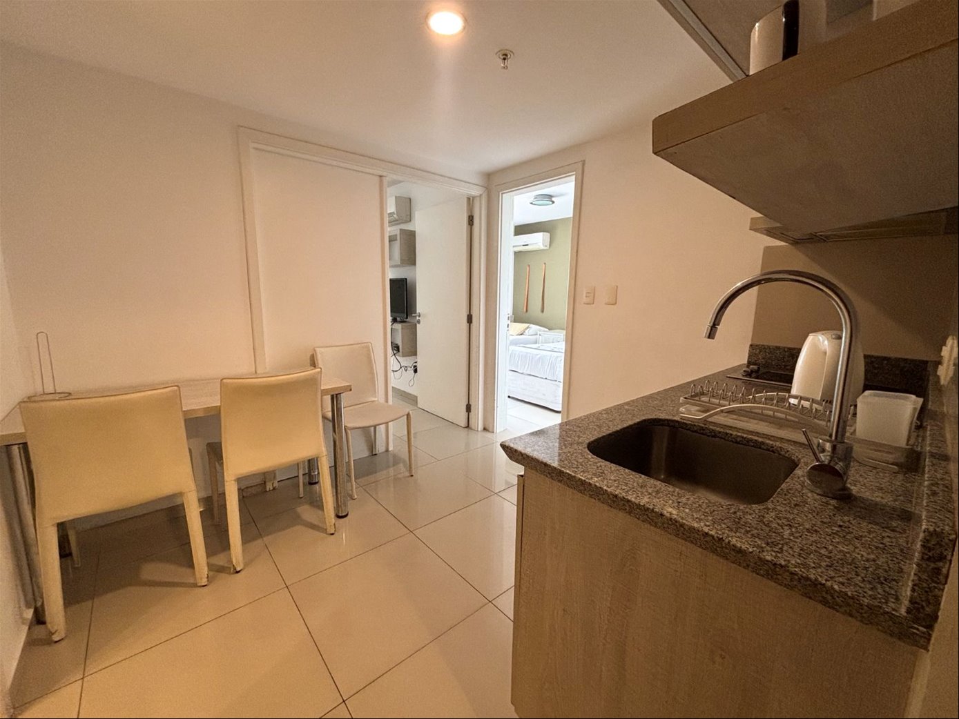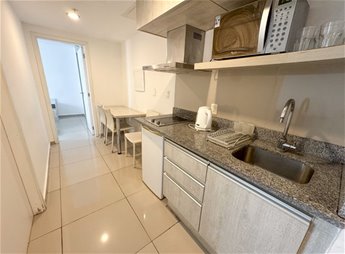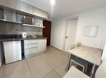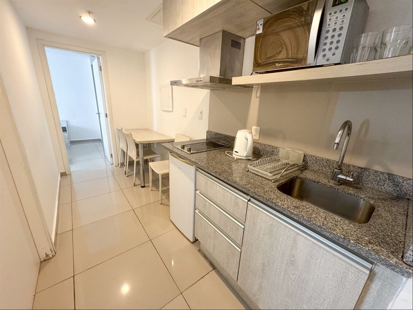 Living comedor con mesa y cocina integrada con frigobar, anafe, microondas y campana.