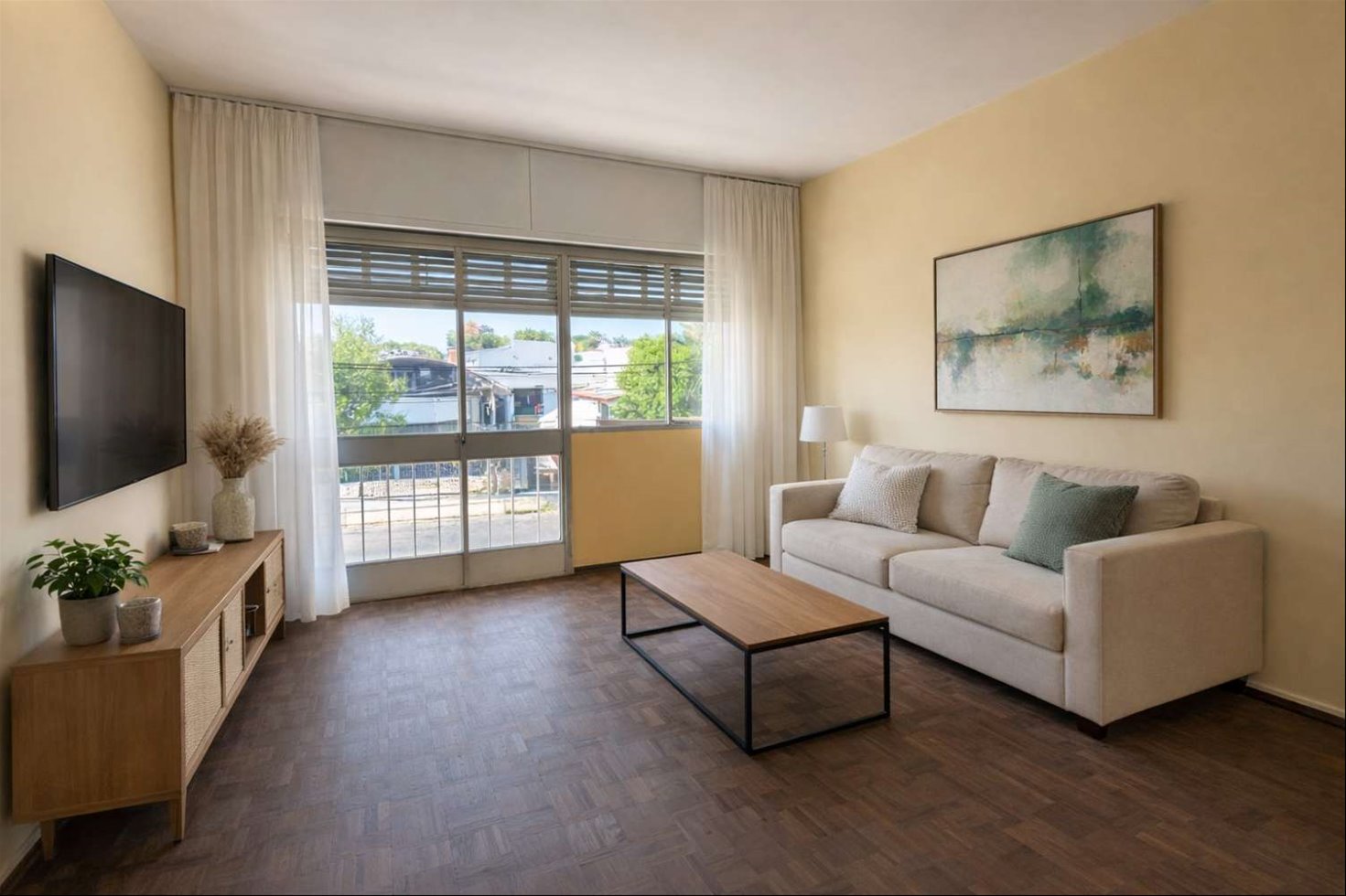 La unidad se desarrolla en primer piso por escalera y presenta una distribución cómoda y funcional. El living comedor, de buen tamaño, se orienta al frente y recibe excelente iluminación natural gracias a su ventana y ventanal hacia la calle. El dormitorio principal, también al frente, cuenta con una amplia ventana de lado a lado, lo que aporta luminosidad y ventilación cuenta con placar con gran capacidad de guardado.