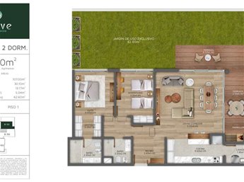 Características: -Living comedor con terraza y parrillero -Cocina integrada con lavadero -2 dormitorios uno en suite (principal con vestidor) -2 baños completos -1 garaje y baulera -Jardín de uso exclusivo -Equipamiento: horno, anafe, campana, AA por ductos, luminarias, cortinas y mamparas