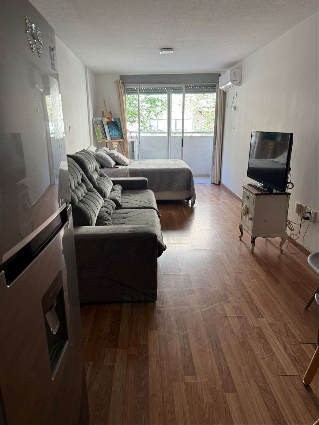 Monoambiente al frente, muy luminoso, de 40 m², con balcón. Cuenta con cocina equipada con anafe y horno, placares, y aire acondicionado.