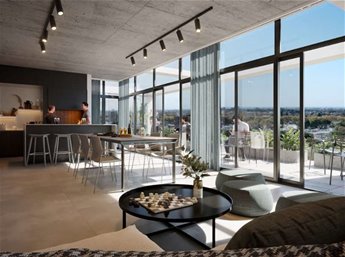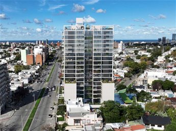 Ofrece monoambientes, 1 y 2 dormitorios, en una torre de 16 pisos, con garajes en planta baja y subsuelo.