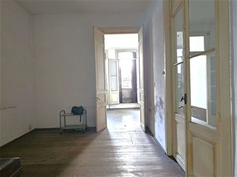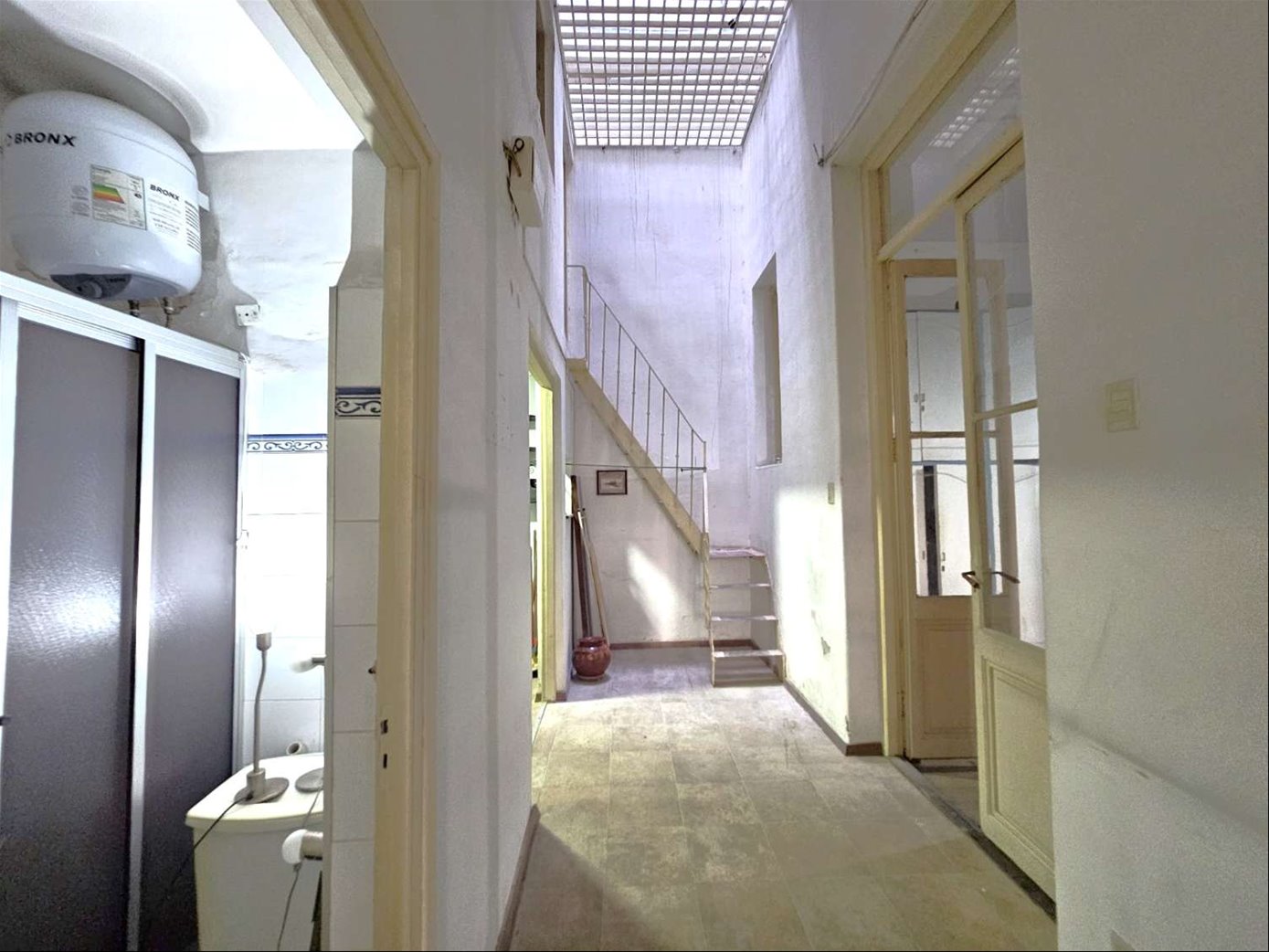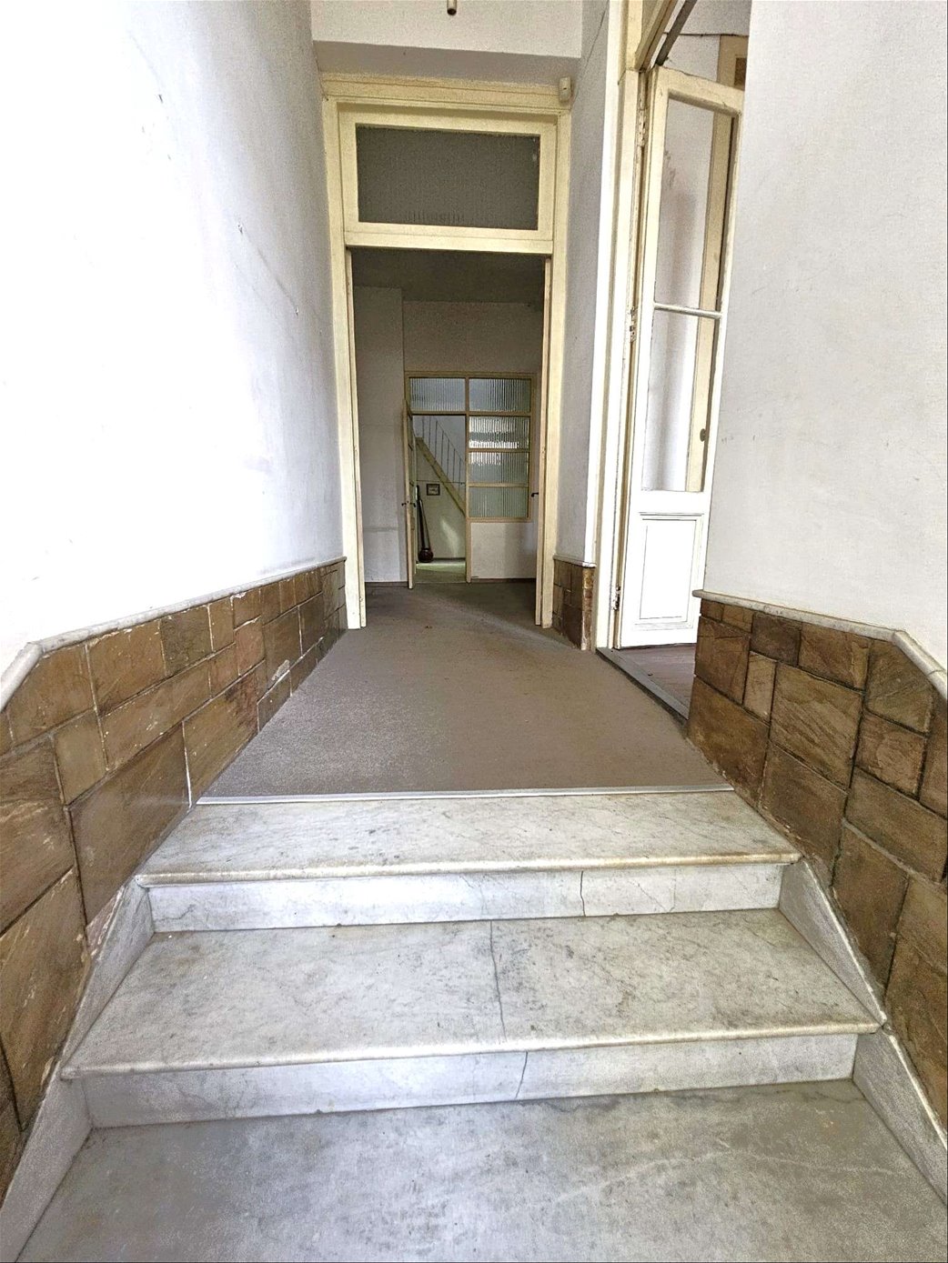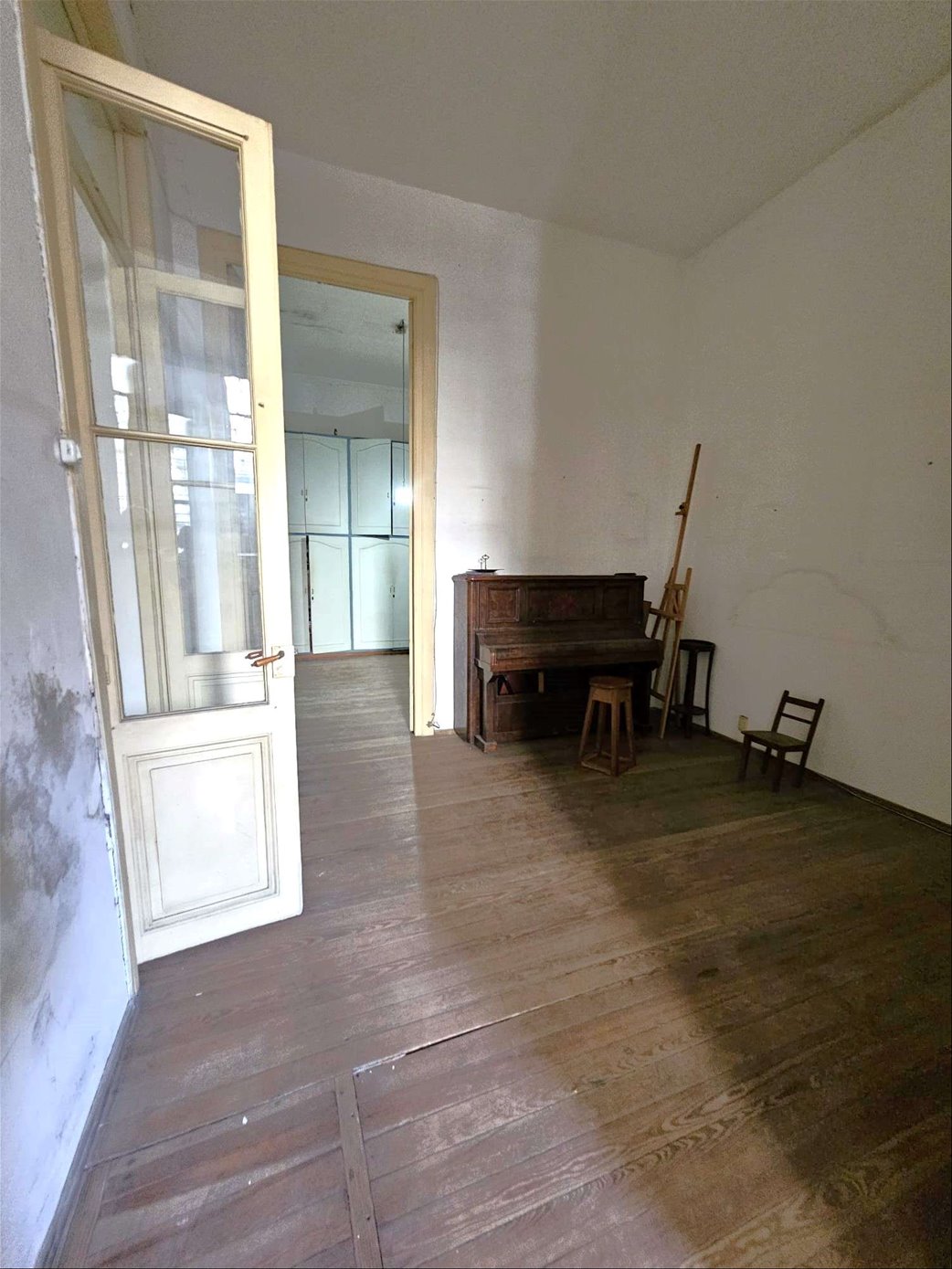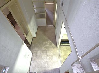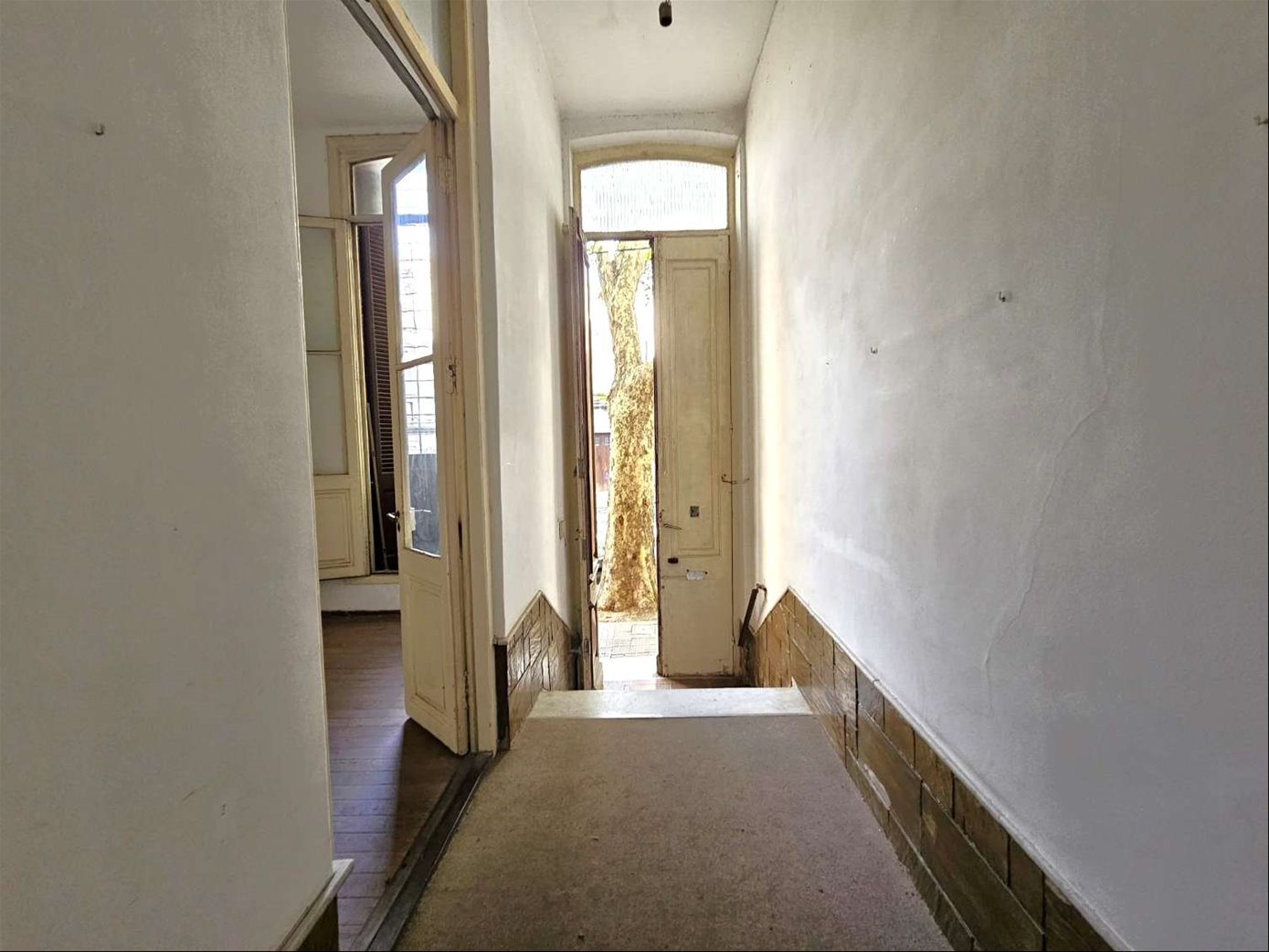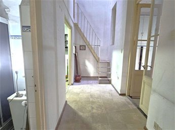 Al ingresar hay un pequeño tramo con 3 escalones en mármol, y luego sobre el lateral derecho se ingresa a una habitación ( la que da al frente ) , esta se comunica con una segunda habitación ciega también amplia y con pisos en buen estado , y detrás esta la ultima habitación con un placard grande de techo a piso. Las tres habitaciones tienen aberturas puertas con altura al medio de la casa donde hay un pequeño estar , cocina con un área pequeña de comedor y escalera que lleva a una habitación arriba con techo de bovedilla .