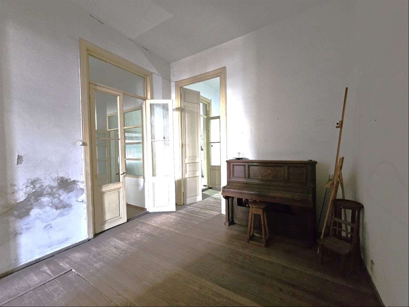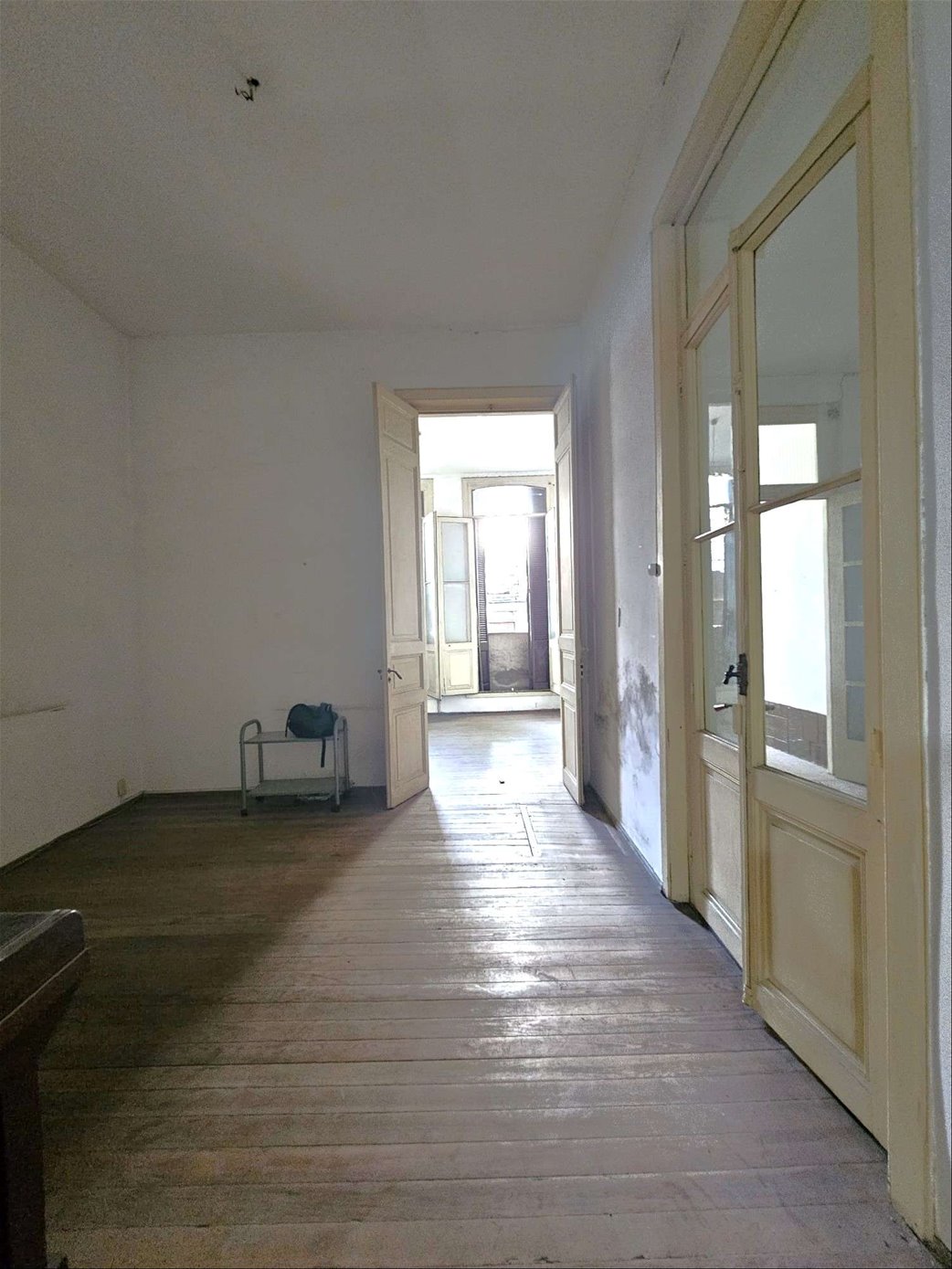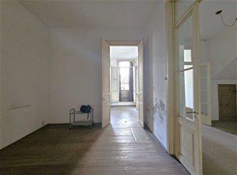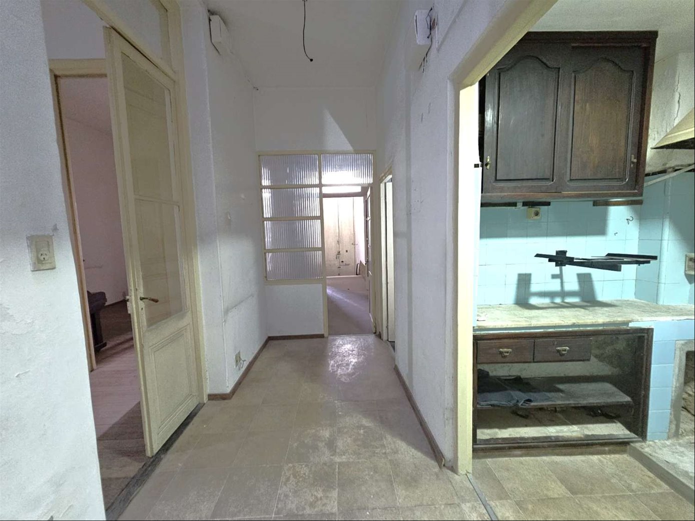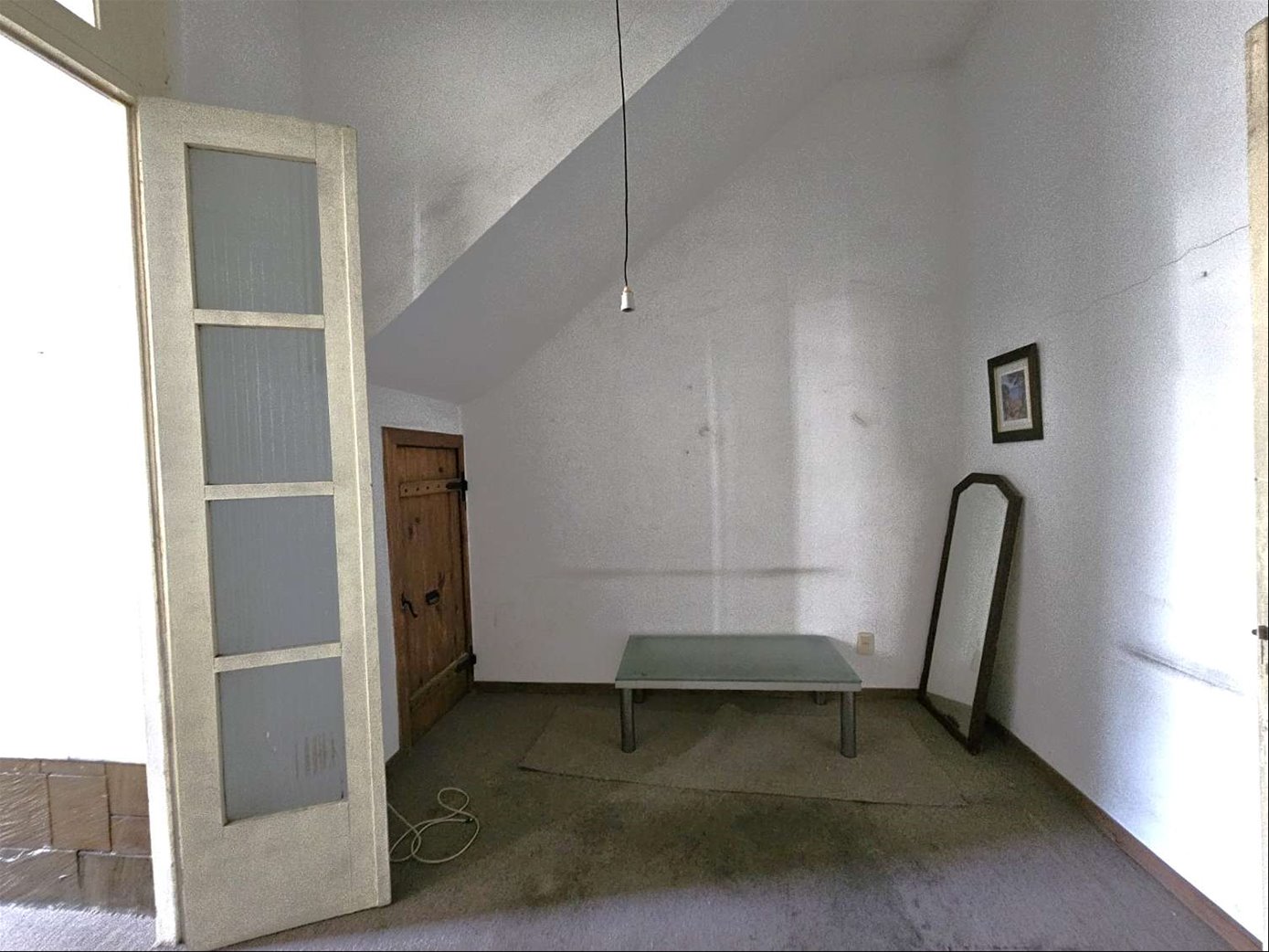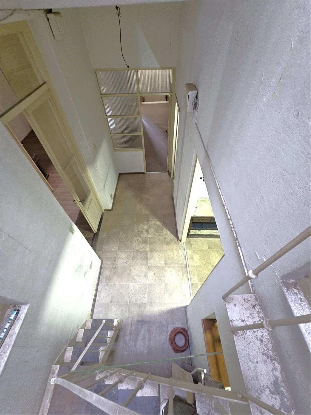 Al ingresar hay un pequeño tramo con 3 escalones en mármol, y luego sobre el lateral derecho se ingresa a una habitación ( la que da al frente ) , esta se comunica con una segunda habitación ciega también amplia y con pisos en buen estado , y detrás esta la ultima habitación con un placard grande de techo a piso. Las tres habitaciones tienen aberturas puertas con altura al medio de la casa donde hay un pequeño estar , cocina con un área pequeña de comedor y escalera que lleva a una habitación arriba con techo de bovedilla .