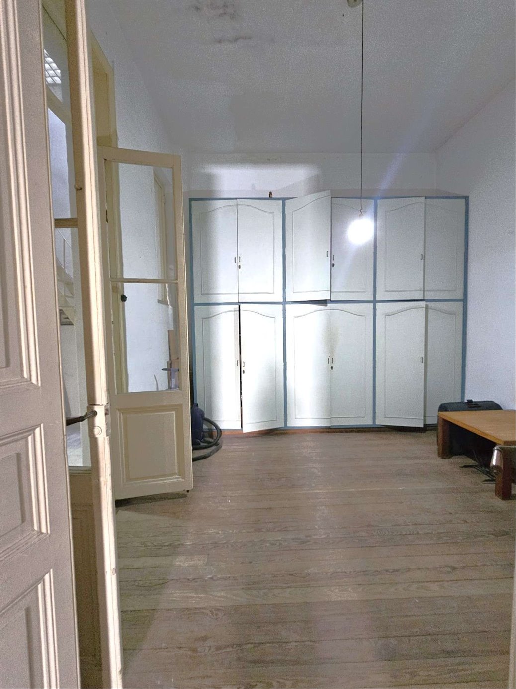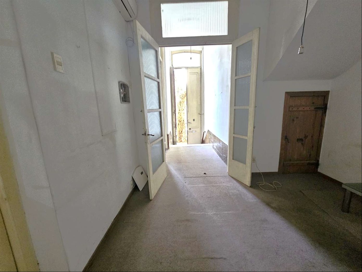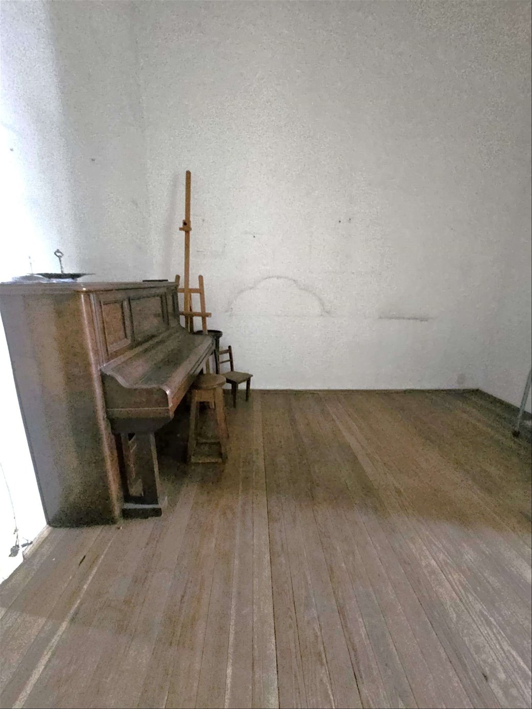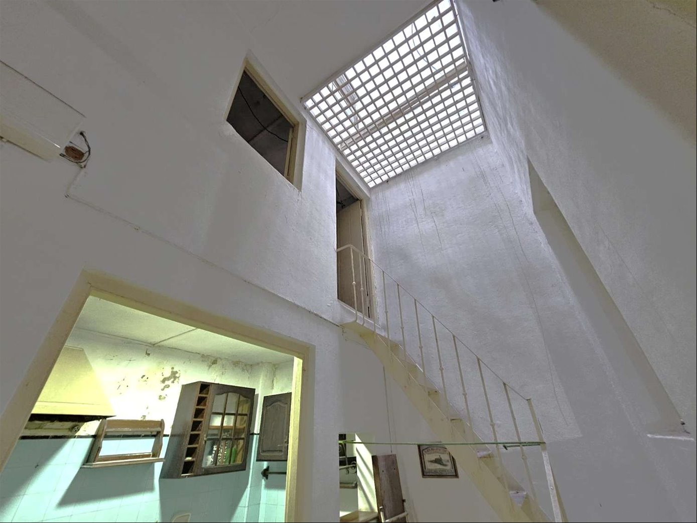 Al ingresar hay un pequeño tramo con 3 escalones en mármol, y luego sobre el lateral derecho se ingresa a una habitación ( la que da al frente ) , esta se comunica con una segunda habitación ciega también amplia y con pisos en buen estado , y detrás esta la ultima habitación con un placard grande de techo a piso. Las tres habitaciones tienen aberturas puertas con altura al medio de la casa donde hay un pequeño estar , cocina con un área pequeña de comedor y escalera que lleva a una habitación arriba con techo de bovedilla .