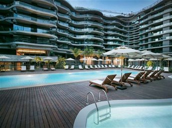 Apartamento en alquiler de 1 dormitorio con jardín en Forum, edificio de diseño en Puerto del Buceo, frente al mar.